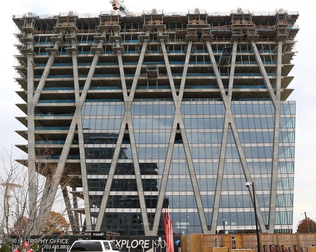 Reston Station OB1 is a new mixed-use building located in Reston, Virginia. Visible to thousands of people who travel to Dulles International Airport each day, this striking project consists of a 16-story office tower showcasing a unique lateral system with a diagonalized, exposed concrete exoskeleton. The tower’s floors are constructed of two-way, post-tensioned, 10-inch-thick concrete slabs with 6-inch drop panels. The exoskeleton columns are constructed of 10,000 psi strength concrete and slope at 11 degrees from vertical matching the building’s north and south edges. A five-story, open-air plaza on the north side of the building is supported by “tree columns,” which start at the base and splay out like a tree to support the overhang above the plaza. The building includes eight levels of below-grade parking laterally supported by the existing below-grade parking structure immediately adjacent to OB1. Thornton Tomasetti provided structural engineering for the project, working in collaboration with owner Comstock Partners, architect JAHN, and contractor DAVIS.